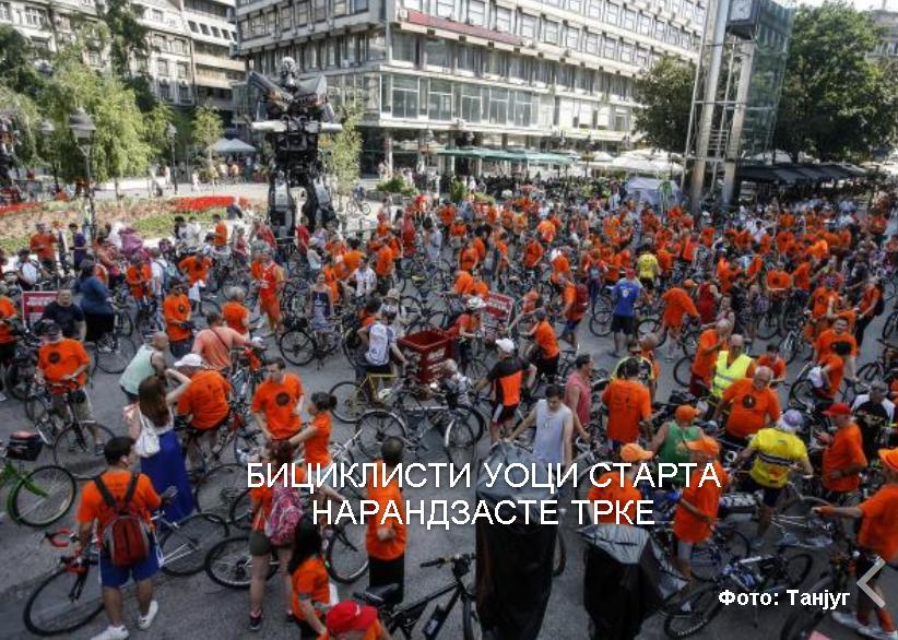 Наранџасту туру вози и неколико новинара Танјуга. Репортер Mарко Петковић каже да jе овде да би промовисао бициклизам у Београду.